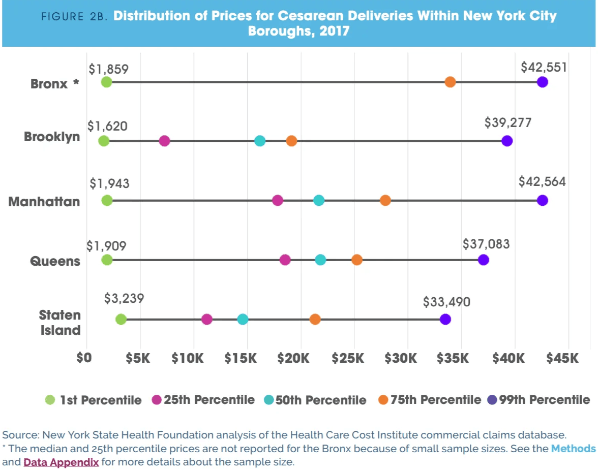 Even though prices are now more transparent due to recent legislation, the costs vary wildly. For example in NYC, a C section at one hospital may cost you 20 times as much as at a different one down the street.